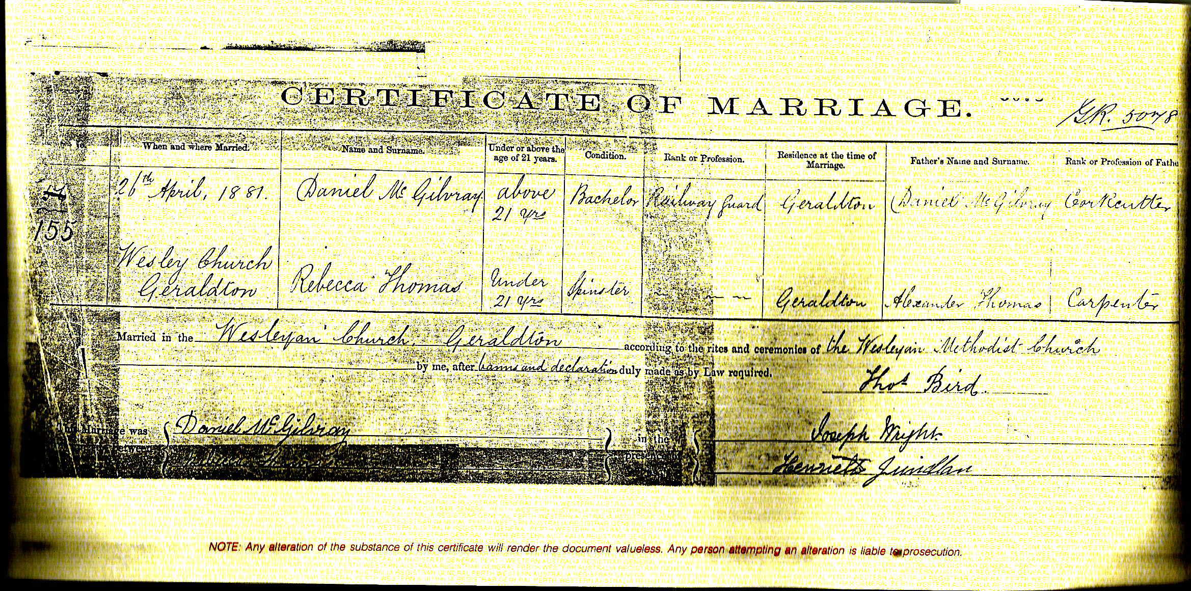 Ticket of LeaveHis Ticket of Leave was granted on 2 August 1867 at Western Australia.1